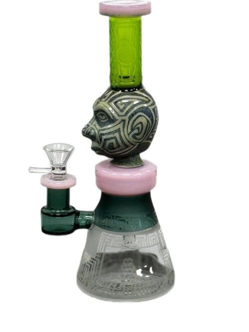 Mayan Face Beaker Bottom Waterpipe Etched Design W/ Bottom Perc